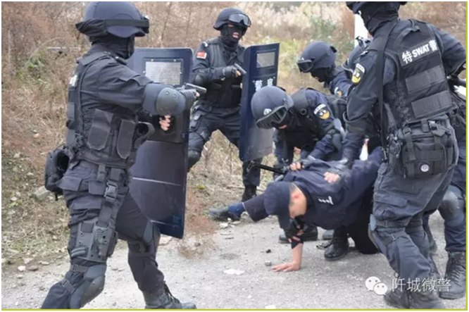 在演練現(xiàn)場(chǎng),2名喬裝成警察的“歹徒”在通往一鄉(xiāng)鎮(zhèn)的公路上設(shè)卡,借口例行檢查,持槍對(duì)一輛有“鎮(zhèn)東護(hù)運(yùn)”字樣的運(yùn)鈔車實(shí)施“搶劫”,在與押運(yùn)人員交談中,不料卻被押運(yùn)人員識(shí)破其“詭計(jì)”,2名“歹徒”原形畢露,立即開槍射擊,就在這一瞬間,押運(yùn)人員依法開槍將其中一名“歹徒”“擊傷”并迅速駕車至安全區(qū)域。同時(shí),電話向警方報(bào)警求助。隨后,警方快速集結(jié)特警、巡警等30余名警力前往處置,通過喊話和政策攻心,2名“歹徒”仍然負(fù)隅頑抗,并向特警開槍。在勸說無效的情況下,指揮員下達(dá)對(duì)持槍“歹徒”采取強(qiáng)制措施的命令。歷時(shí)8分鐘,特警成功將2名“歹徒”制服并抓獲,隨即在醫(yī)護(hù)人員的幫助下,將“受傷”“歹徒”抬上救護(hù)車,送往醫(yī)院……
