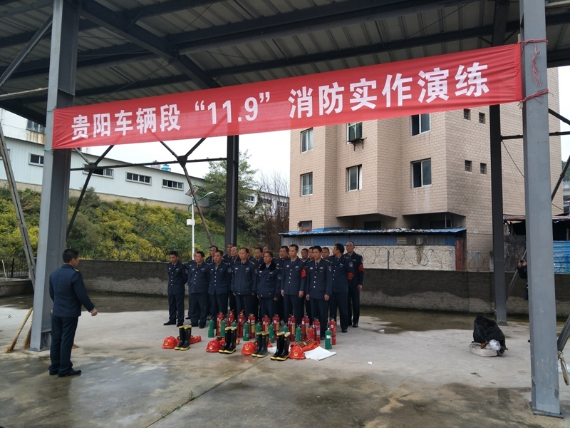 二、為切實(shí)加強(qiáng)我隊保安員消防安全意識,增強(qiáng)防范、撲救火災(zāi)和逃生自救能力,按照“決戰(zhàn)四季度全力保平安”消防工作要求,結(jié)合我隊實(shí)際,于2016年11月9日14:30在后巢客車整備所和貴陽北動車所同時開展“11.9”消防實(shí)作演練,駐車輛段、客運(yùn)段保安隊27人,駐車輛段動車所保安隊26人參加演練,客戶單位80余人到場觀摩學(xué)習(xí),并由保安隊隊長進(jìn)行教學(xué)演練。